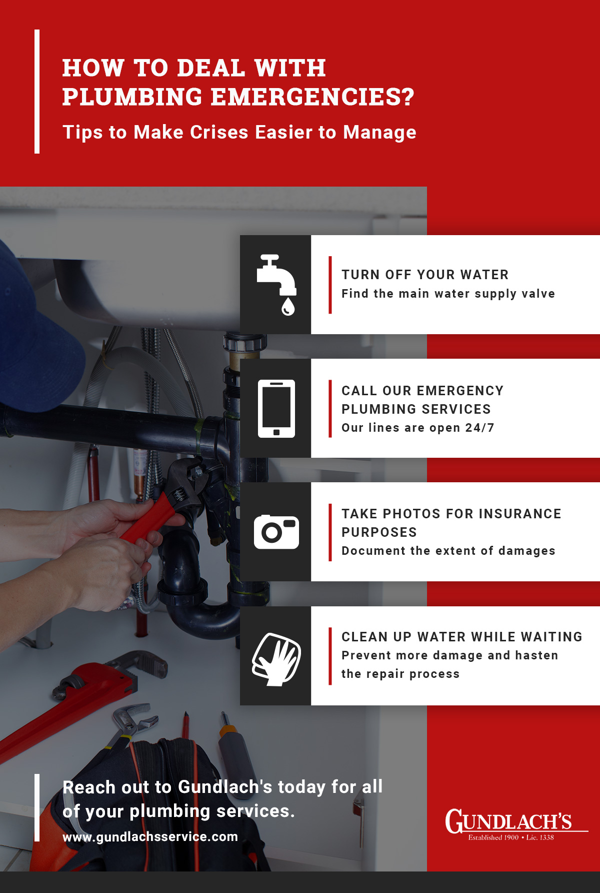 If you’re faced with a plumbing emergency, don’t panic! When it comes to plumbing emergencies, it’s always better to be safe than sorry. It’s important to know what to do in case of a plumbing emergency. At Gundlach’s Plumbing, we are committed to providing the best service experience in Bakersfield, CA. Here are some tips on how you can easily deal with plumbing crises when they arise: