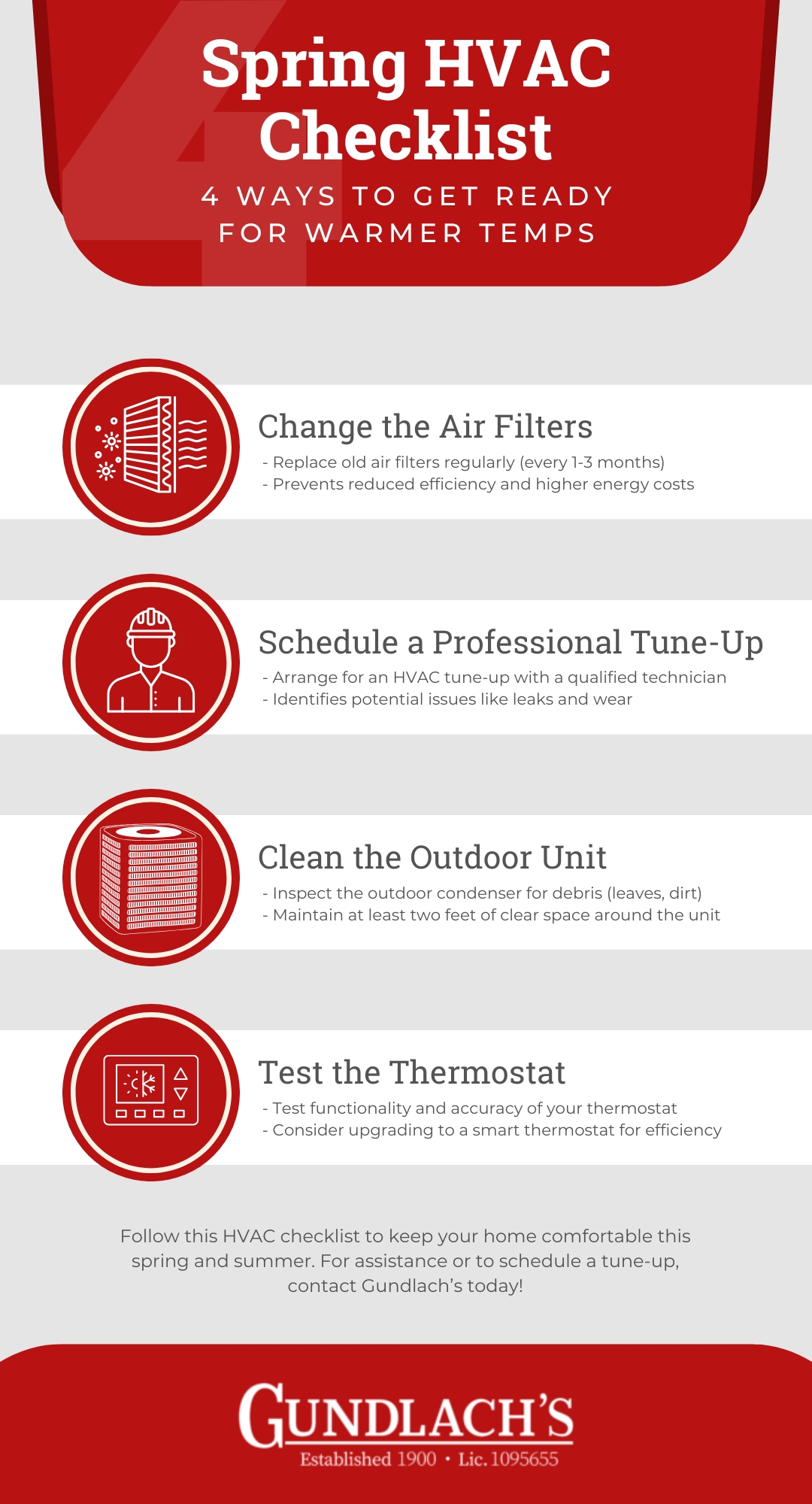 By following this HVAC service checklist, you can ensure that your home remains comfortable throughout the spring and summer months. If you need assistance or wish to schedule a professional tune-up, contact Gundlach’s today!
